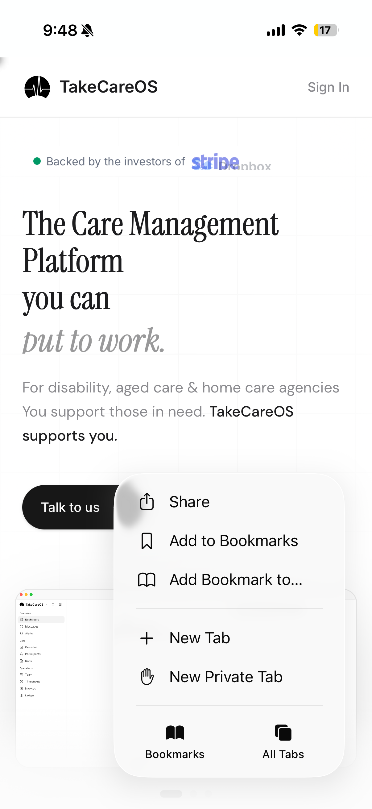 TakeCareOS works like a native app on your phone. Follow the steps below to add it to your home screen — no app store needed.