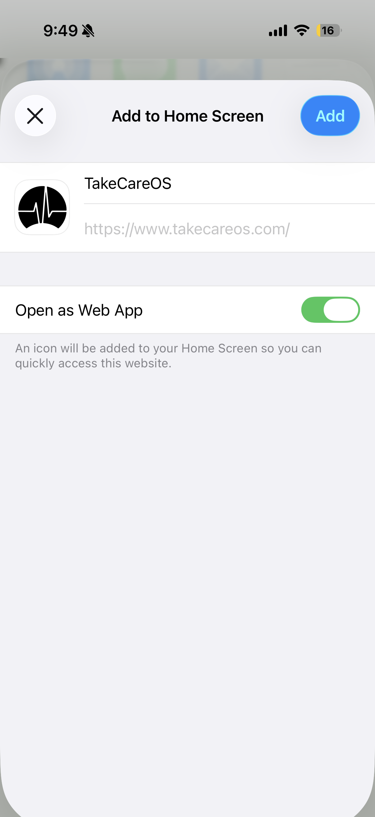 TakeCareOS is a Progressive Web App (PWA). Once installed, it works offline, sends push notifications, and feels just like a native app.